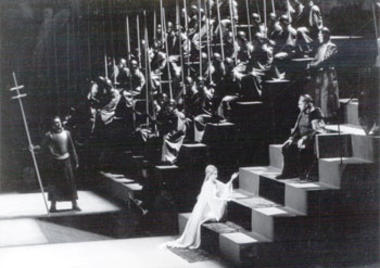 Regie: Götz Friedrich Bühnenbild: Günther Uecker Kostüme: Frieda Parmeggiani Chorleitung: Norbert Balatsch Heinrich der Vogler: Hans Sotin Lohengrin: Siegfried Jerusalem (28.08., 28.8), Peter Hofmann Elsa von Brabant: Karan Armstrong Friedrich von Telramund: Leif Roar Ortrud: Ruth Hesse Der Heerrufer des Königs: Bernd Weikl 1. Edler: Toni Krämer 2. Edler: Helmut Pampuch 3. Edler: Martin Egel 4. Edler: Karl Schreiber 1. Edelknabe: Elisabeth Halton 2. Edelknabe: Irene Hammann 3. Edelknabe: Angelika Jung-Nowski 4. Edelknabe: Elke Burkert Libretto: Richard Wagner Heinrich der Vogler, deutscher König (Bass) Antwerpen, erste Hälfte des 10. Jahrhunderts. Am Ufer der Schelde ruft König Heinrich die brabantischen Männer zum Kampf gegen die Ungarn auf („Gott grüß' euch, liebe Männer“). Vor dem Gericht des Königs erhebt Friedrich Graf von Telramund Klage gegen Elsa, sein Mündel, um dessen Hand er vergeblich geworben hatte. Er beschuldigt sie, ihren jüngsten Bruder Gottfried, der auf geheimnisvolle Weise verschwunden ist, ermordet zu haben; auch stellt er dem König seine Gemahlin Ortrud vor, die heidnische Tochter des Friesenfürsten Radbod („Dank, König dir“). Elsa wird aufgefordert, vor dem König zu der Anschuldigung Stellung zu nehmen. Sie aber spricht in träumerischer Verzückung von einem Ritter, der ihr erschienen sei und Hilfe versprochen habe („Einsam in trüben Tagen“). Keiner der anwesenden Ritter wagt es, im Gotteskampf für Elsa gegen Telramund zu streiten. Nach den Regeln des Gottesgerichts ist Telramund durch die Niederlage im Kampf geächtet. Nachts sitzt er mit seiner dämonischen Gattin Ortrud vor den Mauern der Burg („Erhebe dich, Genossin meiner Schmach“). Er wirft ihr vor, nur unter ihrem bösen Einfluss die Klage gegen Elsa erhoben zu haben. Sie überzeugt ihn, dass der Ritter ein Zauberer sei, dessen Macht durch die kleinste körperliche Verletzung gebrochen werden könne. Auch solle er Elsas Glauben an Lohengrin zu erschüttern trachten, damit sie ihm die verbotene Frage stelle. Auf dem Söller erscheint Elsa, selig vor Glück („Euch Lüften, die mein Klagen“). Ortrud täuscht Reue vor und erweckt dadurch Elsas Mitleid. Während Elsa zu ihr hinabsteigt, ruft Ortrud die heidnischen Götter um Hilfe für ihre finsteren Pläne an („Entweihte Götter“). Der König geleitet das Paar feierlich ins Brautgemach (Chor „Treulich geführt“). Zum ersten Mal allein, gestehen sie einander ihre Liebe (Duett „Das süße Lied verhallt“). Doch Elsas Zweifel sind geblieben. Noch kann der Ritter sie durch liebevolle Worte abhalten („Atmest du nicht mit mir die süßen Düfte“). Immer drängender wird ihre Ungeduld, auch seine ernste Mahnung („Höchstes Vertrau'n“) bleibt fruchtlos. Wie in einer Vision sieht sie ihren Geliebten mit dem Schwan entschwinden und stellt schließlich die unheilvolle Frage. Da stürzt Telramund herein, um Lohengrin mit dem Schwert zu überfallen. Der Ritter vermag ihn jedoch niederzustrecken und befiehlt seinen Männern, die Leiche vor des Königs Gericht zu tragen, dem er Rede stehen werde. © Harenberg Kulturführer Oper,Lohengrin